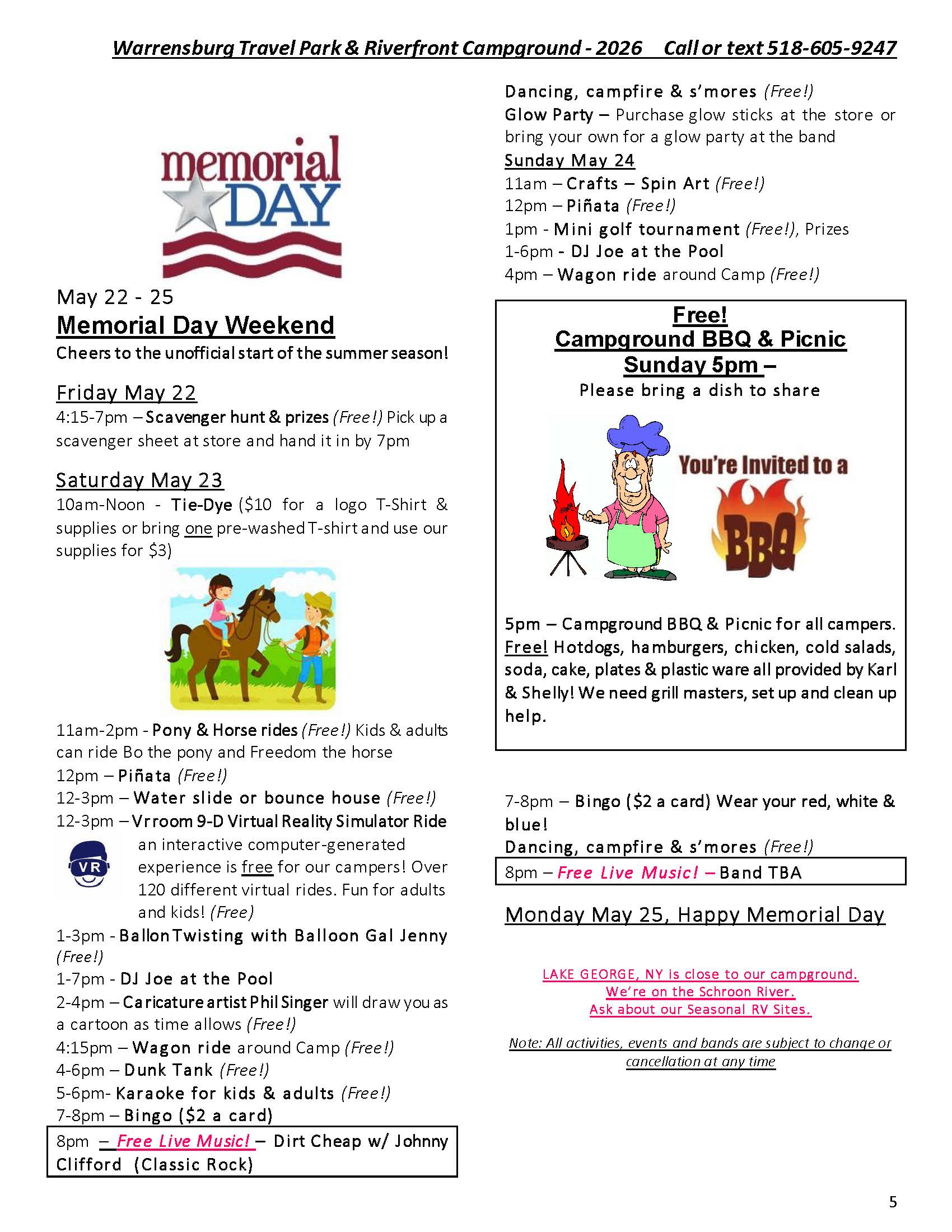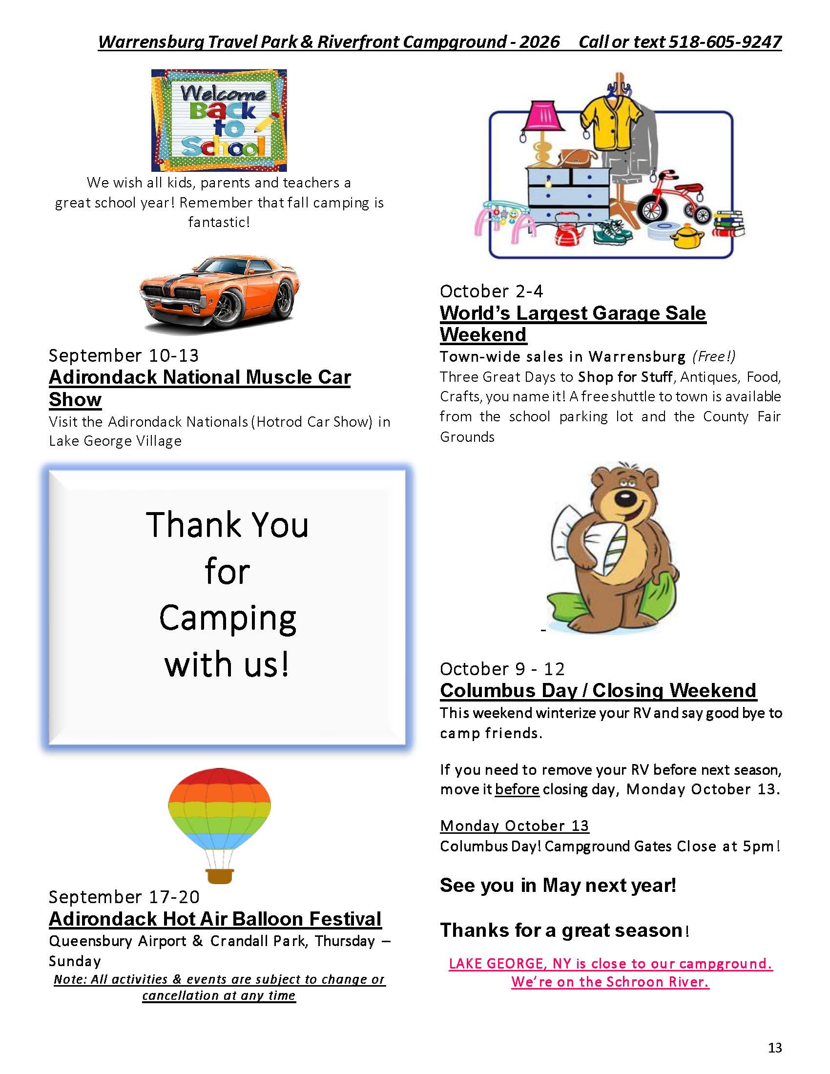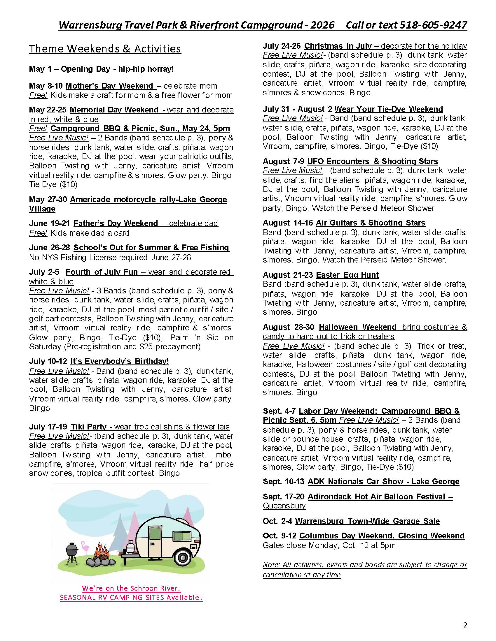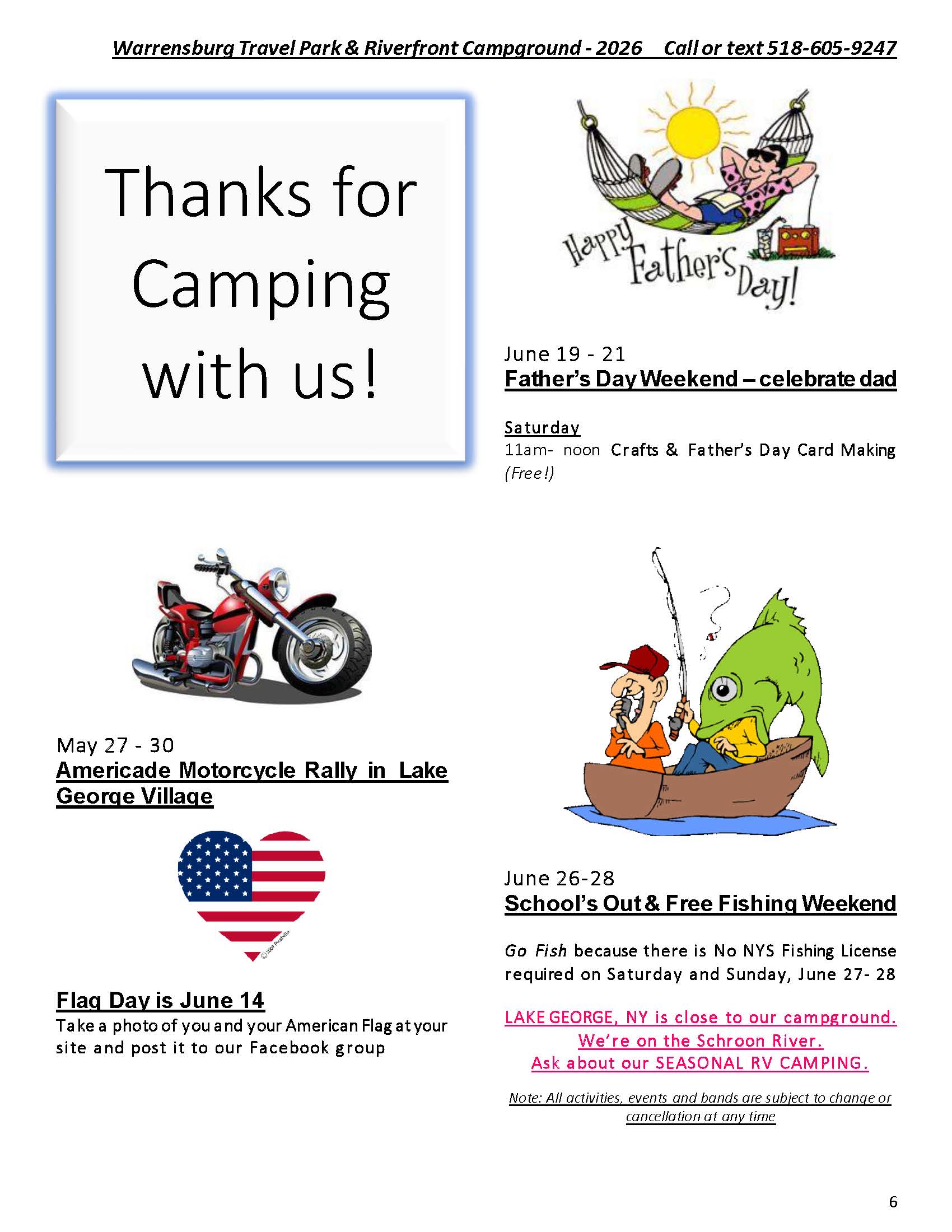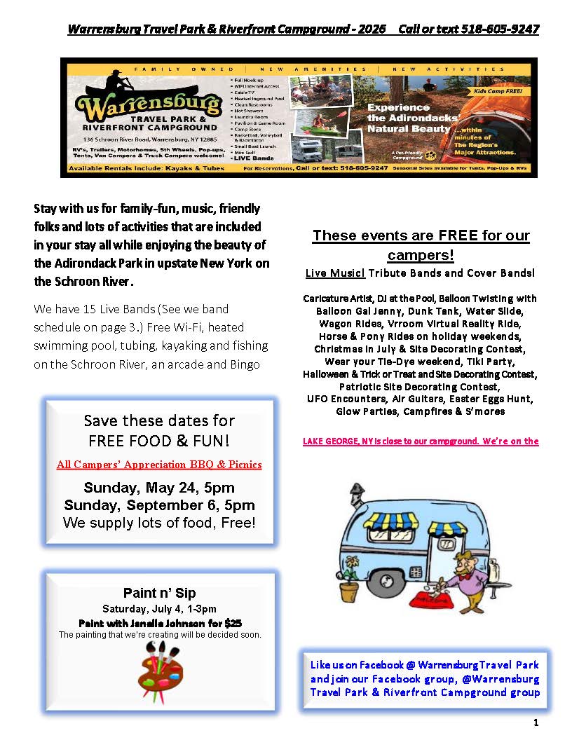 Welcome to the Activities Calendar for Warrensburg Travel Park & Riverfront Campground in the Lake George Region!