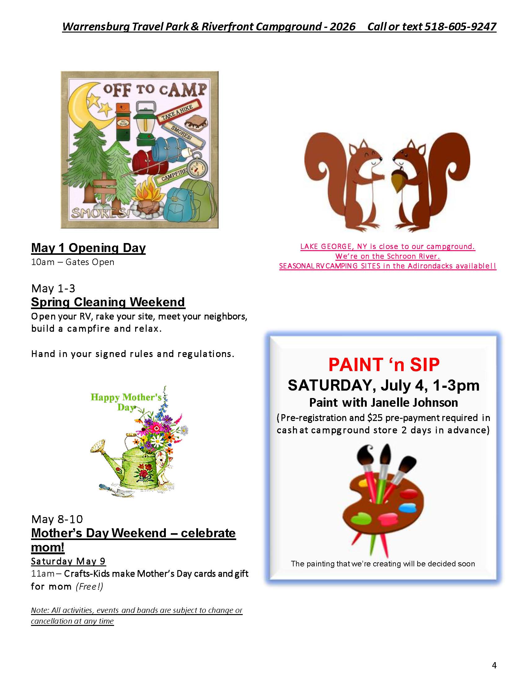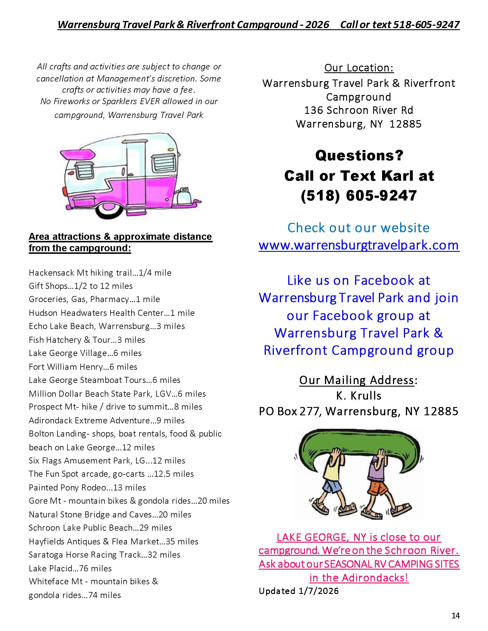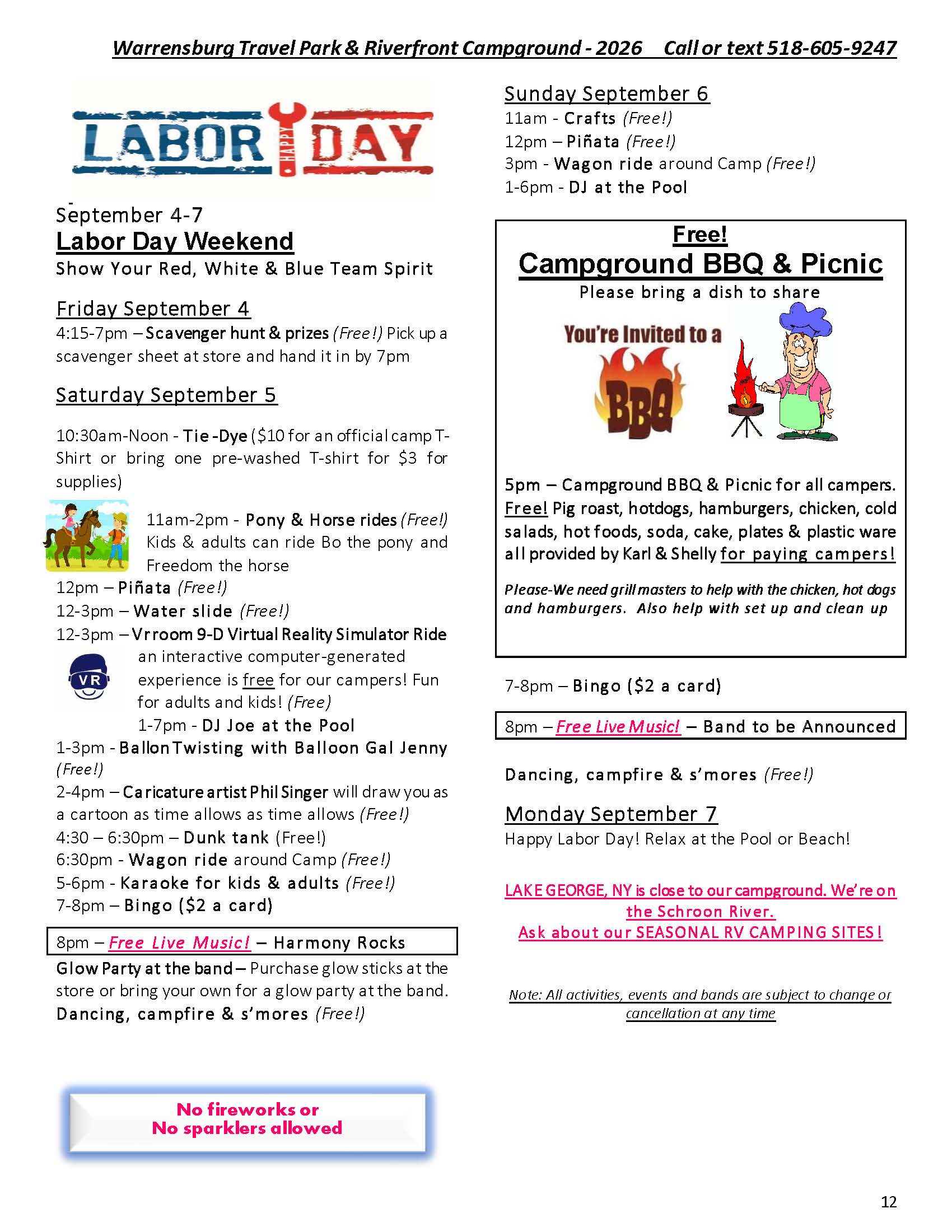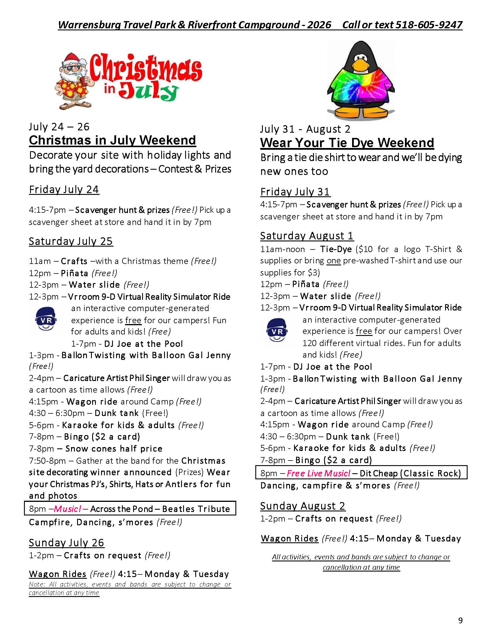 Welcome to the Activities Calendar for Warrensburg Travel Park & Riverfront Campground in the Lake George Region!
