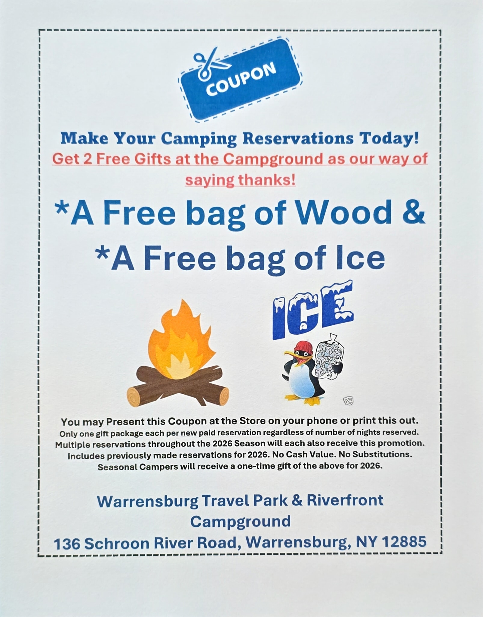 Free bag of ice & Free bag of wood upon arrival. See coupon for details.