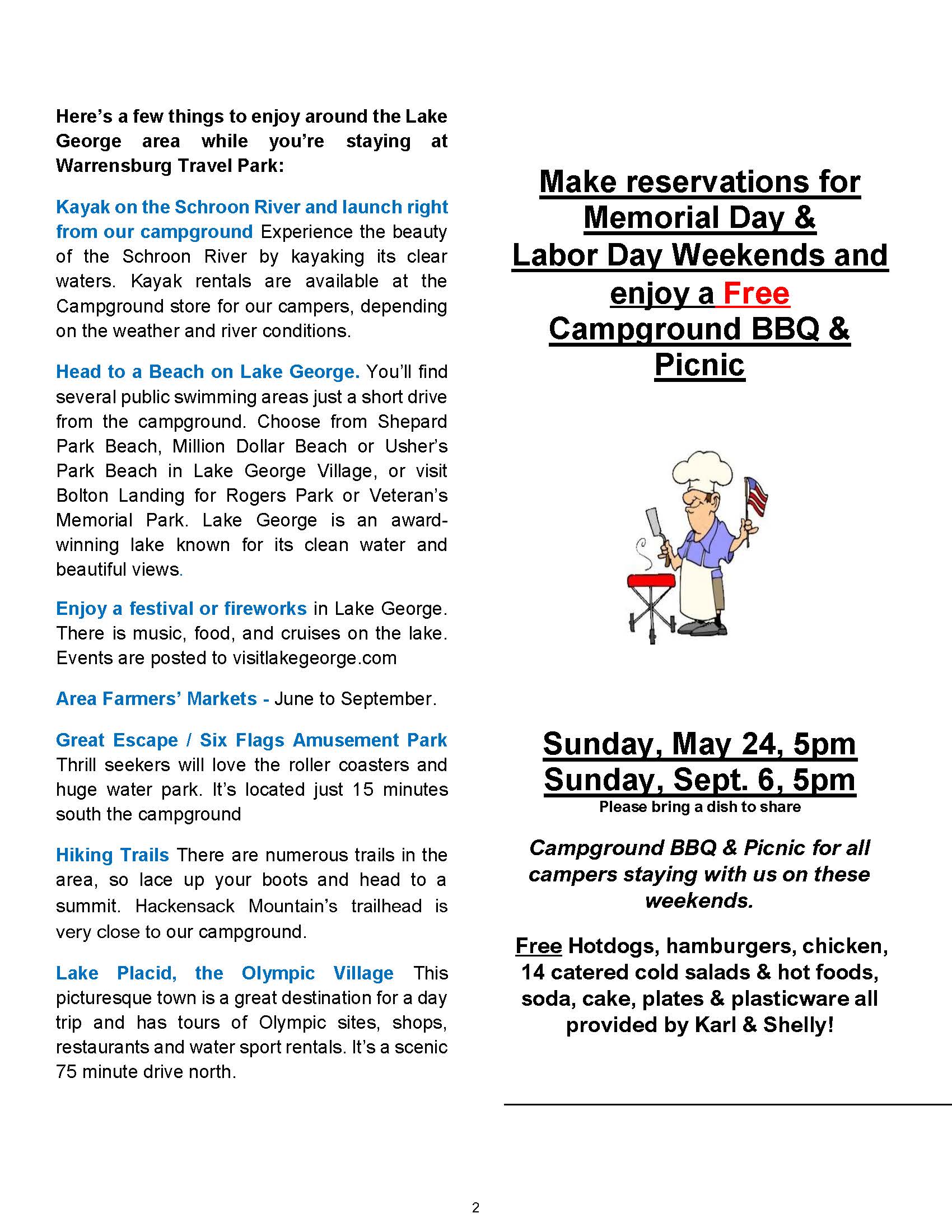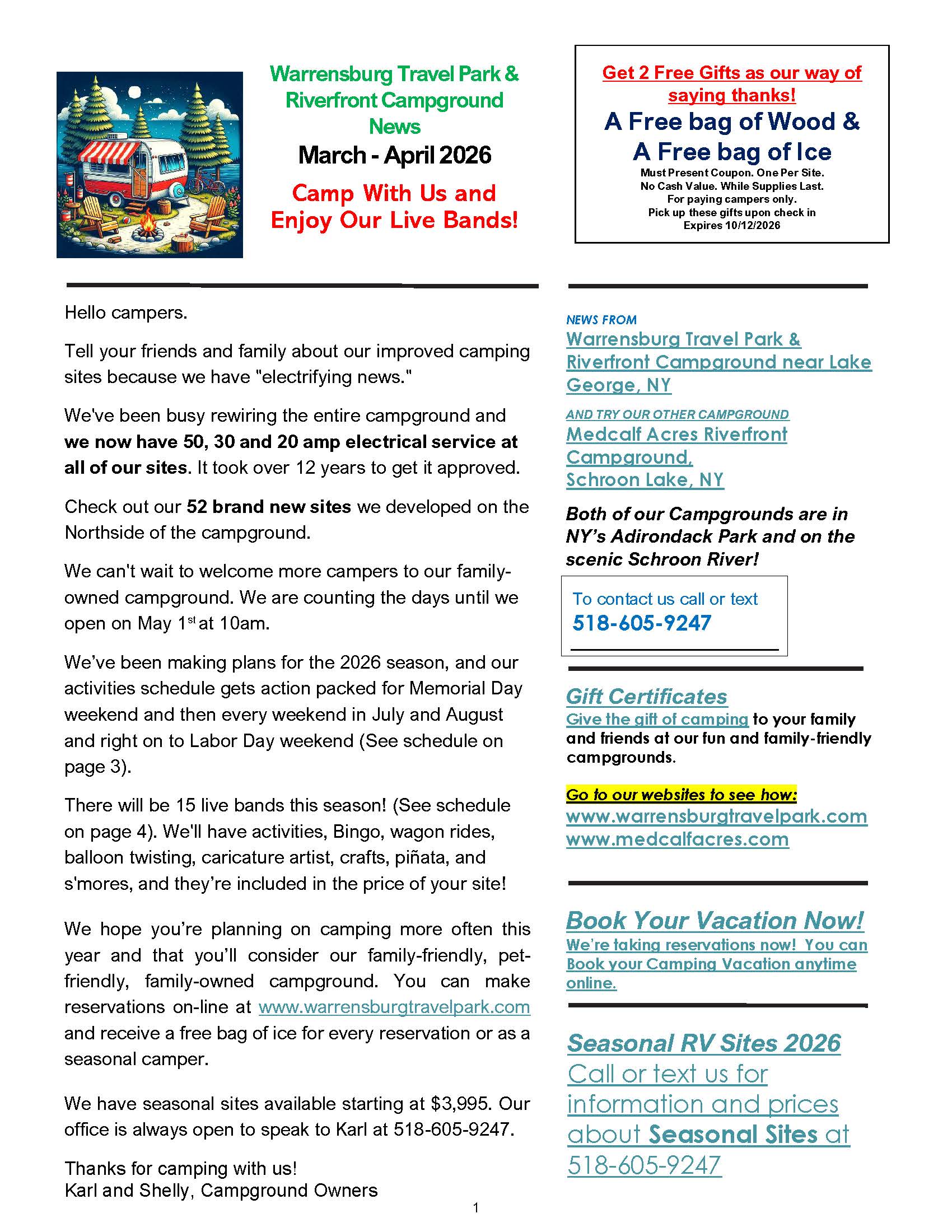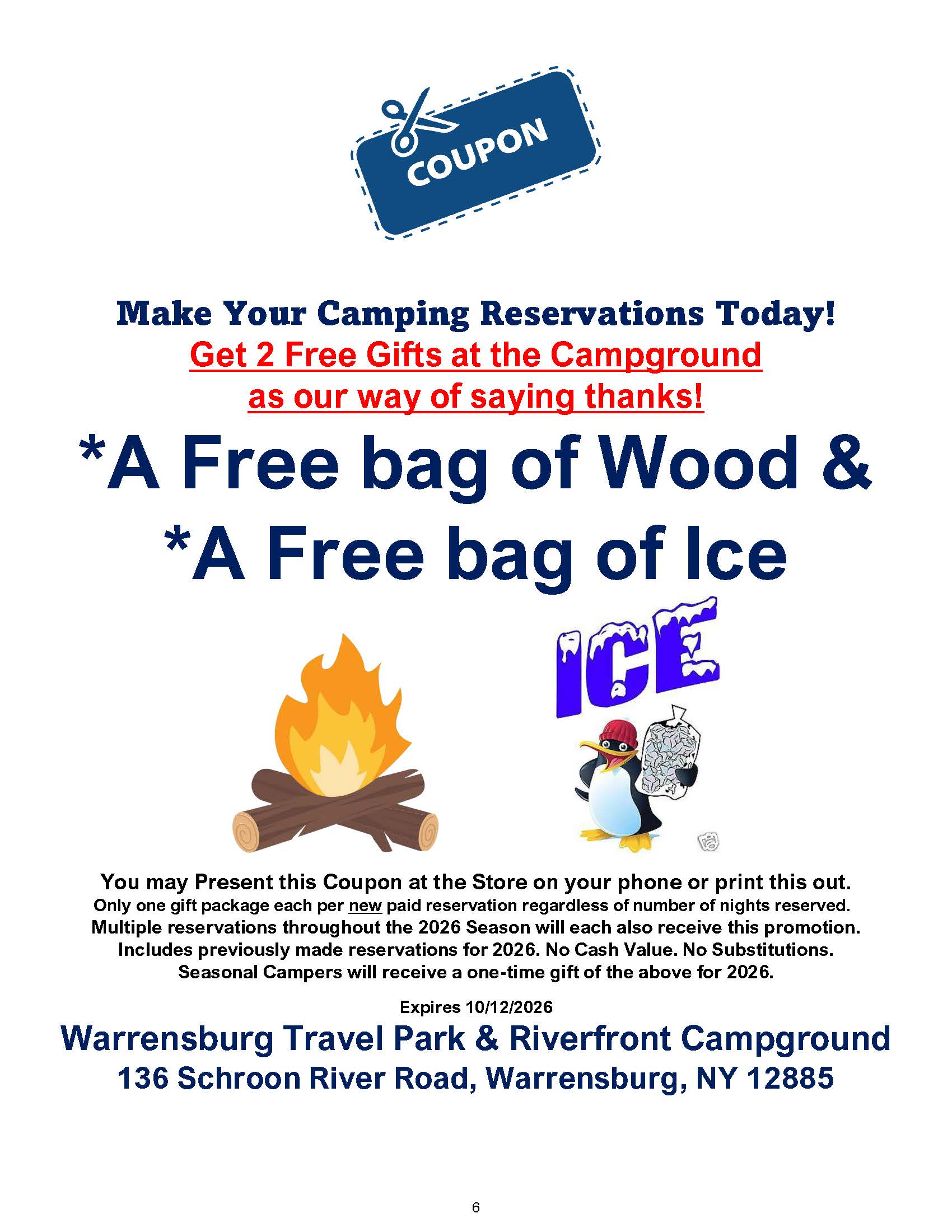 In the tranquil embrace of Warrensburg Lake George Region, our newsletter becomes your trusted companion, weaving together the charm of the region with exclusive coupons in our Campground Store for the unforgettable Warrensburg Travel Park experience.